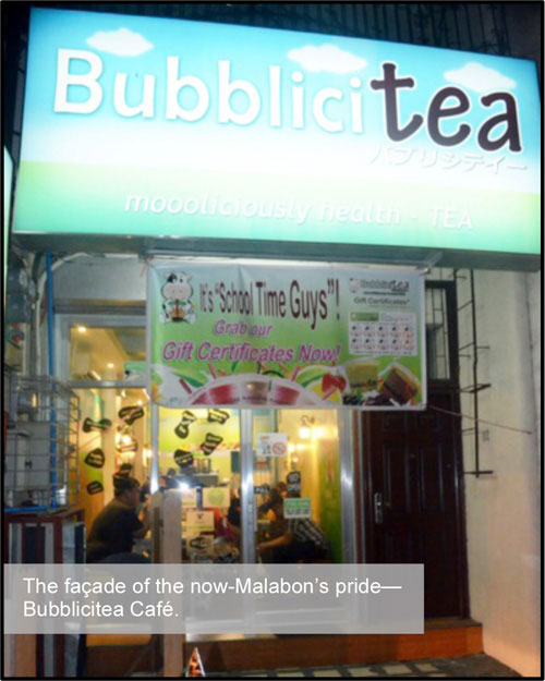 Bubblicitea Café was built for the folks of Malabon who deserved better. One enters the café not feeling like being inside a mall or in Malabon even. ‘What we want is to give our customers good ambience... feel relaxed and comfortable, but still want them to feel at home, here in Malabon’. The menu is the brainchild of Annie’s eldest daughter, Ivy. Customers can order drinks such as Dark Vader, Toffee Lee Jones, Pretty in Pink, Wintermelon Romance, and TBC (The Bubblicitea Classic). Simple as it is, Bubblicitea offers premium milk tea concoctions, all mixed with ‘passion, with a dash of love and happiness’. It also boasts of comfort food, which aims to set a trend in culinary excellence. But still, all things are kept simple and affordable, all for the Malabon folks.